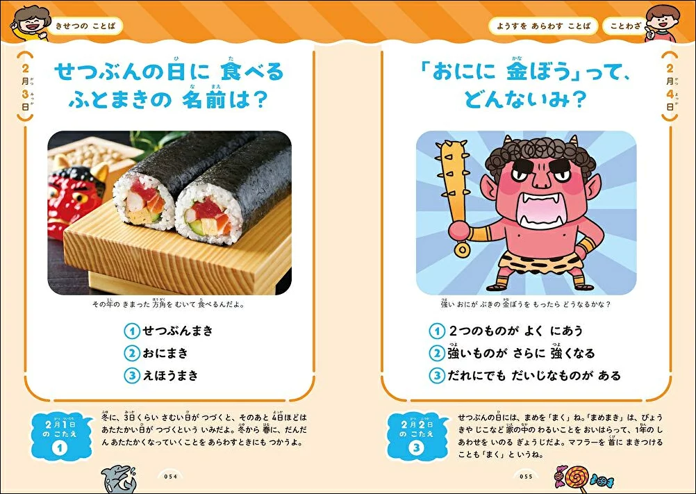 1月1日から1日1つクイズ形式になっていて、子ども(小1)も楽しみながら一緒にやりました。大人でも知らない問題もあったりして、親子で楽しめます。絵も載っているので見やすいですし、回答の所に解説もあり、勉強になります。
