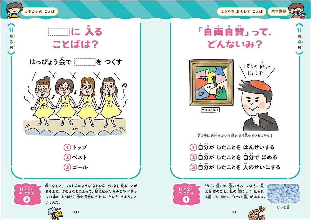 来春小学1年生になる息子。入学前に語彙力を増やしておきたいと思って購入したけど、大正解!めちゃくちゃハマっている!!王道の「ことわざ」「慣用句」「四字熟語」「故事成語」だけでなく、「オノマトペ」「季節のことば」「気もちのことば」「季節のことば」などもあるので、長く楽しんでくれそう。