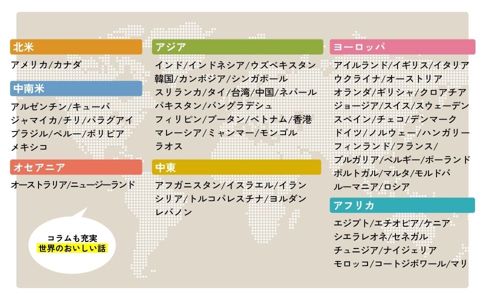 インド、インドネシア、ウズベキスタン、韓国、カンボジア、シンガポール、スリランカ、タイ、台湾、中国、ネパール、パキスタン、バングラデシュ、フィリピン、ブータン、ベトナム、香港、マレーシア、ミャンマー、モンゴル、ラオス