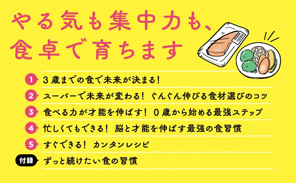 1 3歳までの食で未来が決まる!/2 スーパーで未来が変わる!ぐんぐん伸びる食材選びのコツ/3 食べる力が才能を伸ばす!0歳から始める最強ステップ/4 忙しくてもできる!脳と才能を伸ばす最強の食習慣/5 すぐできる!カンタンレシピ/付録 ずっと続けたい食の習慣