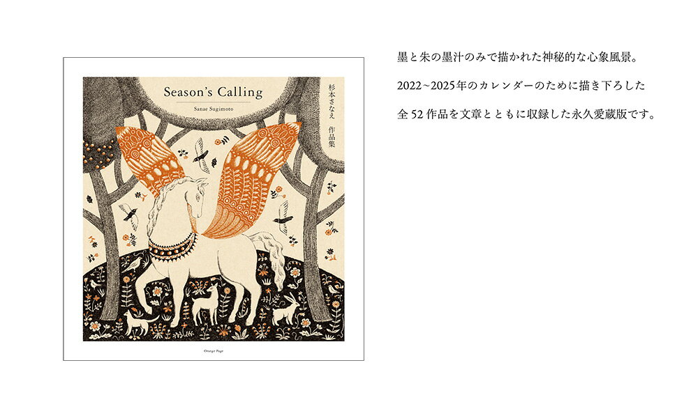 墨汁の墨と朱の2色だけで構成される繊細な筆致と大胆な構図。希代の人気イラストレーター・杉本さなえによる4年間のカレンダー、計52葉の作品と文章をすべて収録した永久愛蔵版。めくったページそれぞれに、見る者が自らの物語を重ね、沈思のひとときを愉しめる一冊。