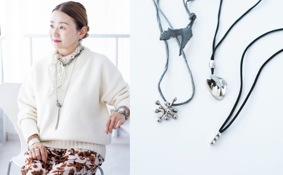 「カジュアルスタイルが格好いい」と感じる先輩方の共通点は、シルバージュエリーをいつも上手に取り入れているところ。「シルバージュエリーは、年中重宝するわよ」という先輩方に、取り入れ方を教わりました。「ル・ピボット」のデザイナー・小林一美さん。白いニットにボリュームのあるシルバーのチェーンネックレスと、タッセルネックレスを合わせた、ホワイトコーデが素敵。右は、小林さんの愛用品。