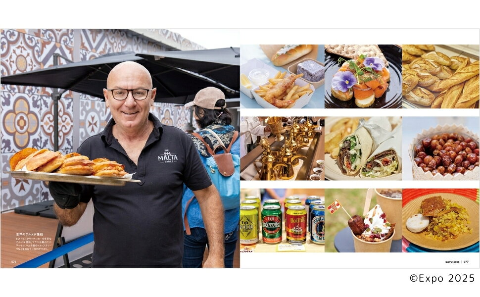 そして、なんといっても、笑顔が満載。民族衣装を着ておもてなしをする各国のスタッフ、音楽やダンスを披露するエネルギッシュなパフォーマー、万博を存分に楽しむ来場者など、たくさんの笑顔が本書にはあふれています。もちろん、個性豊かなパビリオンや食欲をそそるグルメの写真も盛りだくさん。