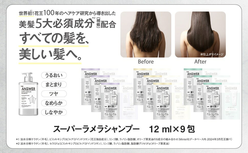 花王100年のヘアケア研究から生まれたアイテムで、うるおい、まとまり、ツヤめき、なめらかで、しなやかな美しい髪へ。