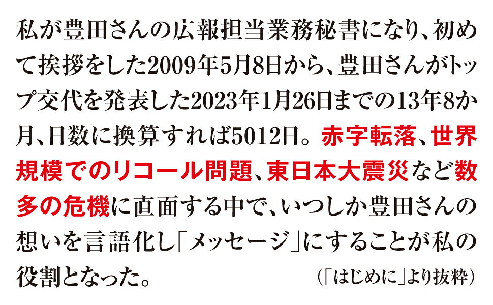 赤字転落、世界規模でのリコール問題、東日本大震災など数多の危機に直面する中で、いつしか豊田さんの想いを言語化し『メッセージ』にすることが私の役割となった」(同「はじめに」)