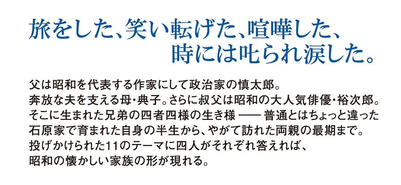 旅をした、笑い転げた、喧嘩した、時には叱られ涙した。父は昭和を代表する作家にして政治家の慎太郎。奔放な夫を支える母・典子。さらに叔父は昭和の大人気俳優・裕次郎。そこに生まれた兄弟の四者四様の生き様ー普通とはちょっと違った石原家で育まれた自身の半生から、やがて訪れた両親の最期まで。投げかけられた11のテーマに四人がそれぞれ答えれば、昭和の懐かしい家族の形が現れる。