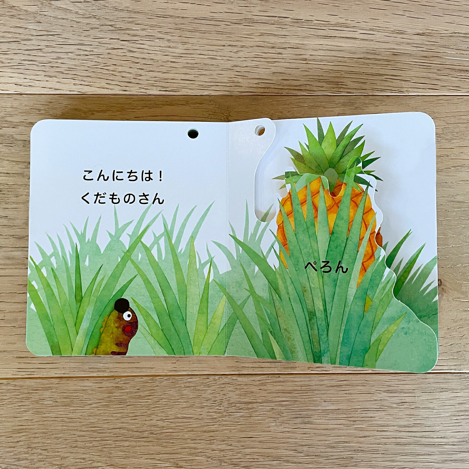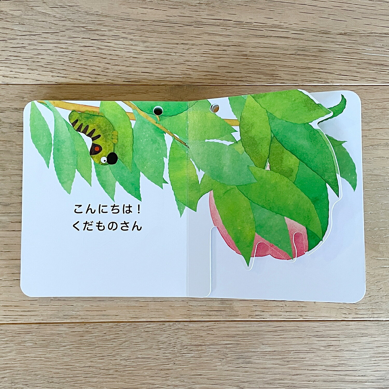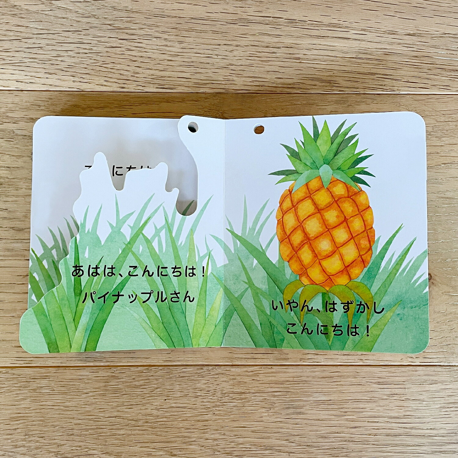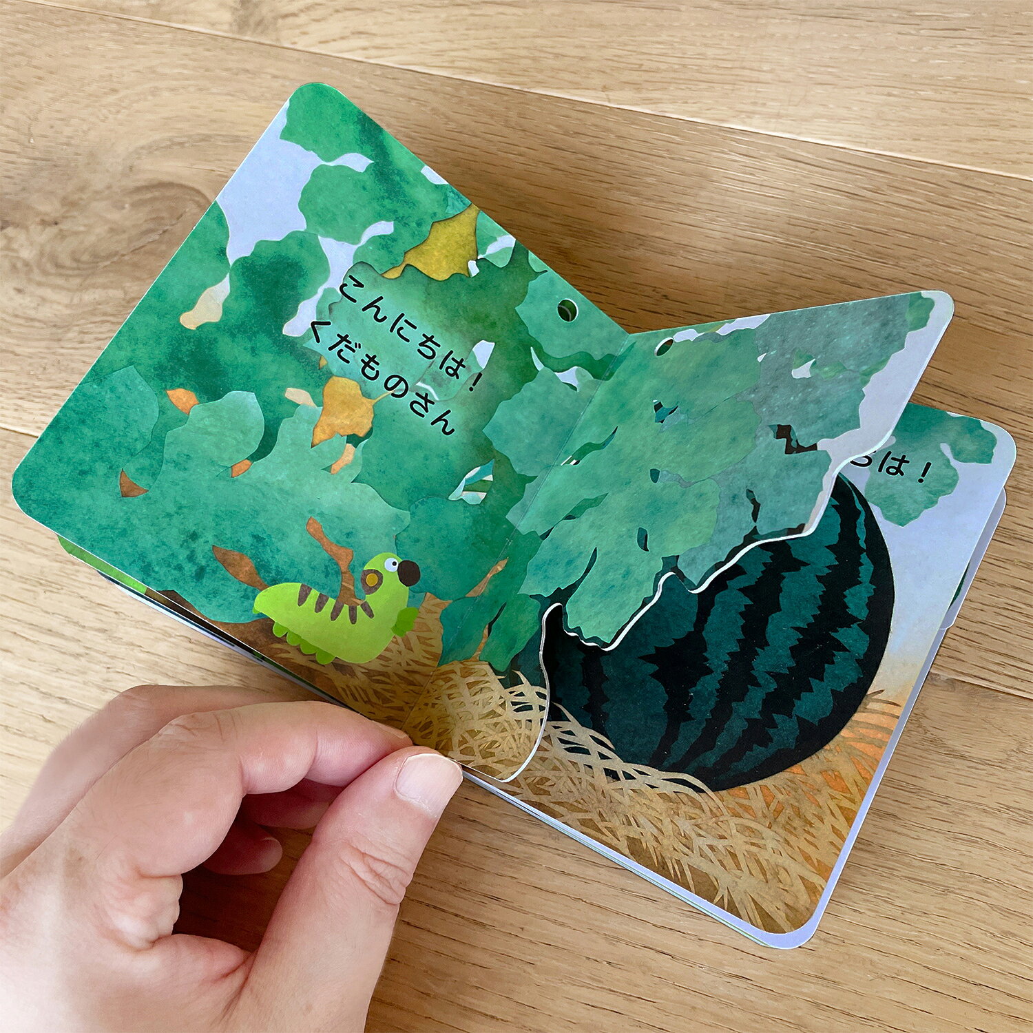 りんごやみかんは木の枝に、スイカは土の上になど、果物の実り方も織り込んだ学び要素のある本文で、長く楽しめる内容です。