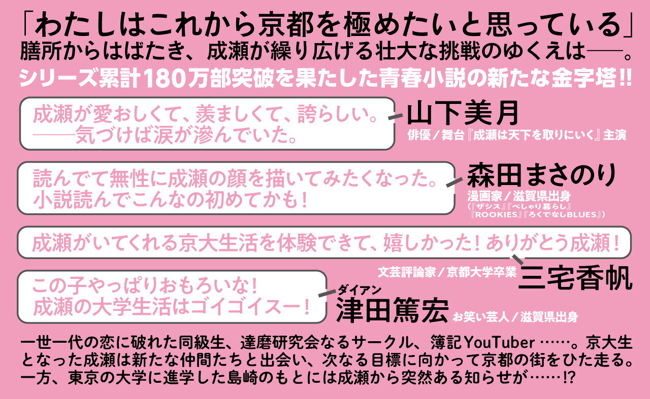 唯一無二の主人公、膳所から京都へ! 令和最強の青春小説シリーズ堂々完結! 高校を卒業し、晴れて京大生となった成瀬あかり。一世一代の恋に破れた同級生、達磨研究会なるサークル、簿記YouTuber……。新たな仲間たちと出会った成瀬の次なる目標は“京都を極める”! 一方、東京の大学へ進学した島崎みゆきのもとには成瀬から突然ある知らせが……? 最高の主人公に訪れる、究極のハッピーエンドを見届けよ!
