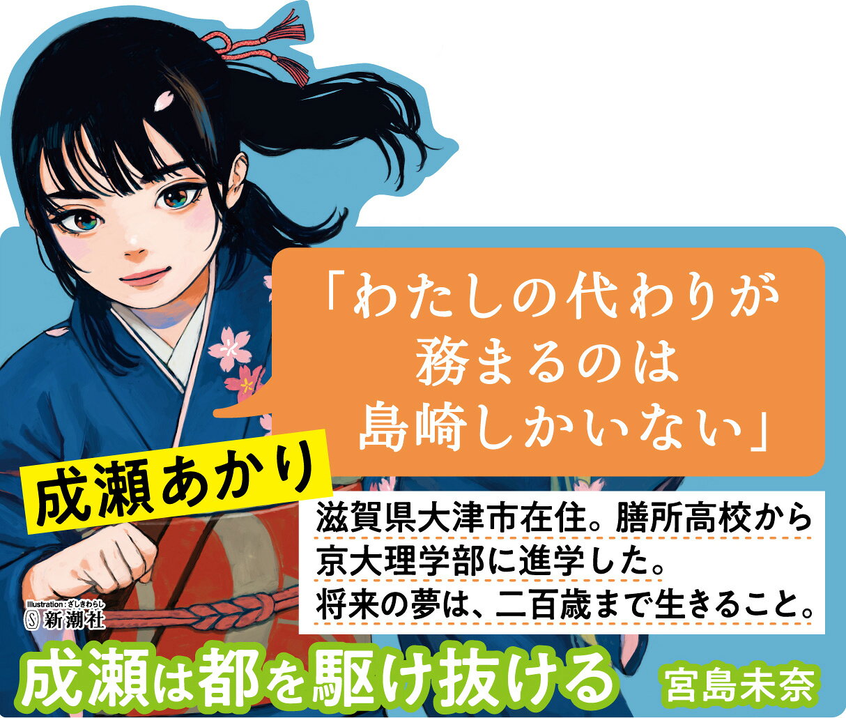 膳所高校を卒業し、晴れて京大生となった成瀬あかり。一世一代の恋に破れた同級生、「達磨研究会」なる謎のサークル、簿記YouTuber、娘とともに地元テレビの取材を受ける母、憧れの人に一途に恋焦がれる男子大学生……。千年の都を舞台に、ますます個性豊かな面々が成瀬あかり史に名を刻む中、幼馴染の島崎のもとには成瀬から突然速達が届いて……? 全6篇、最高の主人公に訪れる大団円を見届けよ!