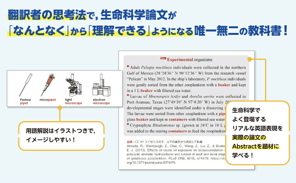 第1章 論文読解入門(生命科学で「言葉」を学ぶ理由/科学論文の基本構造「IMRaD」 ほか)/第2章 実験・開発・分析ー生命科学の研究室へようこそ!(基本的な実験器具/手技・操作 ほか)/第3章 体と命を支えるしくみ(皮膚/髪 ほか)/第4章 バイオテクノロジーー実生活での生命科学の応用(発酵とバイオ素材/遺伝子編集の歴史と将来の可能性 ほか)