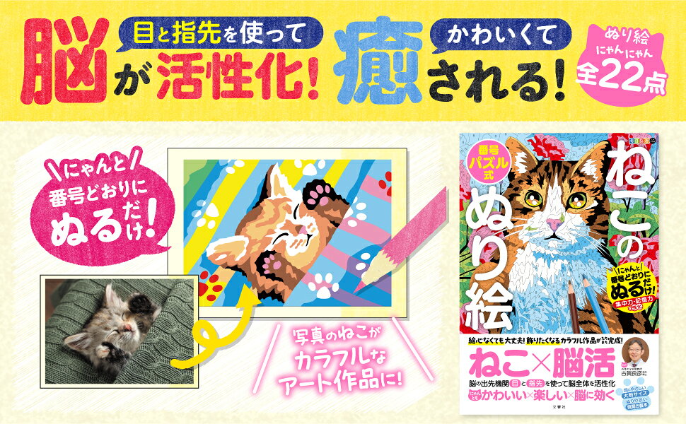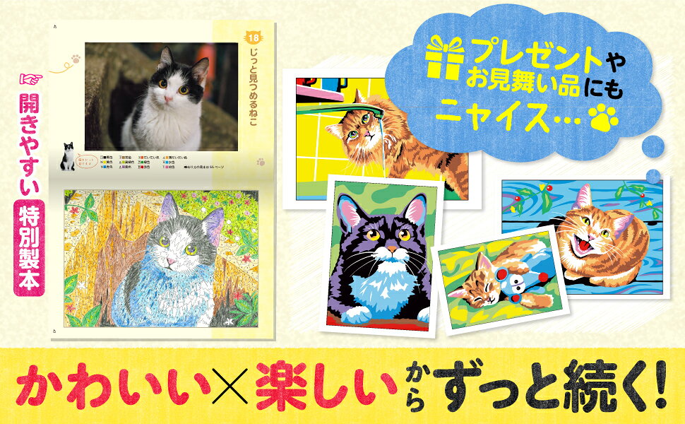 番号どおりにぬるだけで、にゃんともかわいくカラフルなねこの絵がたちまち完成!