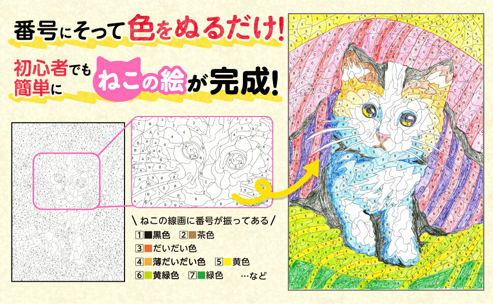 番号どおりにぬるだけで、かわいくカラフルなねこの絵がたちまち完成!