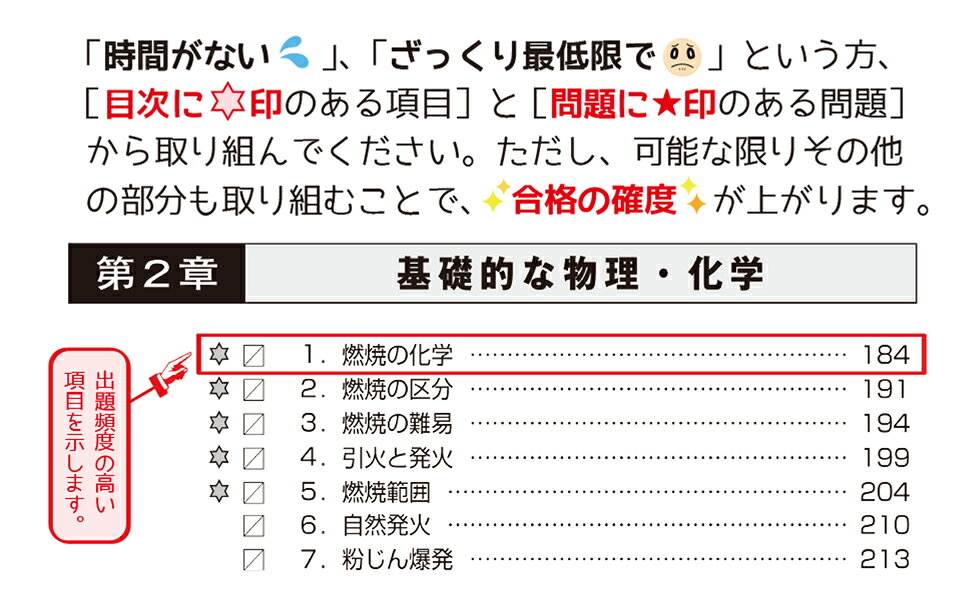 第1章 危険物に関する法令(消防法の法体系/消防法で規定する危険物/第4類危険物 ほか)/第2章 基礎的な物理・化学(燃焼の化学/燃焼の区分/燃焼の難易 ほか)/第3章 危険物の性質・火災予防・消火の方法(危険物の分類/第4類危険物の性状/第4類危険物の消火 ほか)
