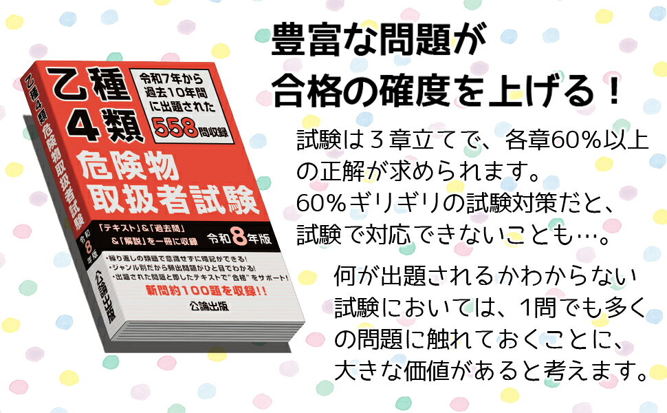 | ひとこと | 試験に出やすい問題に特化した一冊! | 乙種4類の導入としても使えます。 | 危険物取扱者資格の頂点!豊富な問題が合格をサポートします。 | 科目免除と複数受験で効率よく乙種制覇! |