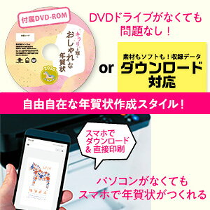 「なるべく手間をかけずに作りたい」「パソコンにDVDドライブが付いていない」そんな方にもぴったり! 付属年賀状ソフトも素材も専用サイトからダウンロードできます。スマホを使った年賀状づくりも本誌ページにて操作解説しています。