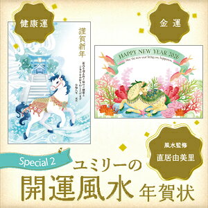 「ユミリー風水」でおなじみ風水建築デザイナーの直居由美里先生監修による「開運風水年賀状」。贈られる側はもちろん、贈る側にも幸せを呼び込むハッピーモチーフがふんだんに散りばめられた開運年賀状です。開運コラムも必読です。