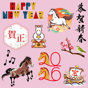 午年のイラスト、賀詞、添え書き、年号など年賀状のアクセントになるパーツが盛りだくさん!