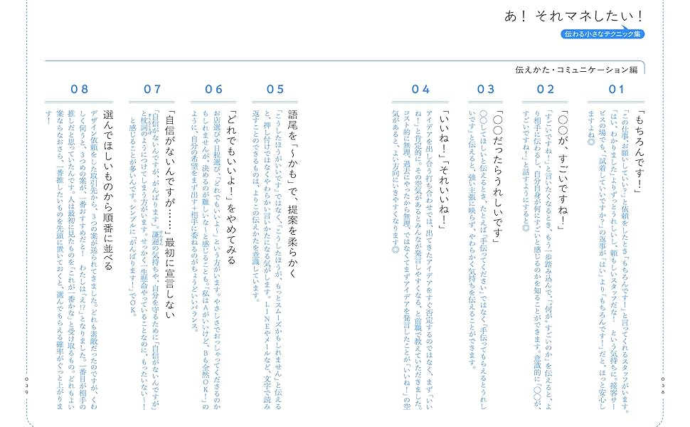 この本では、やりたいことの伝えかた、みんなが気持ちよく仕事が進む伝えかた、断りかた・謝りかた、会話を楽しむコツなど、全部で82個の工夫を詰め込みました。