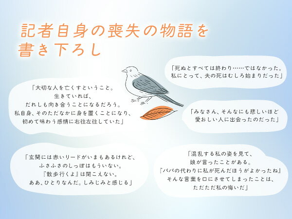 朝日新聞人気連載「喪の旅」に加え、夫を亡くした自身の体験を書き下ろして1冊の本に。死別の悲しみを抱いてどう生きていくかー。作家、詩人、教員、僧侶、主婦…大切な人を亡くしたたくさんの人に会って話して書いた、グリーフケアの記録。