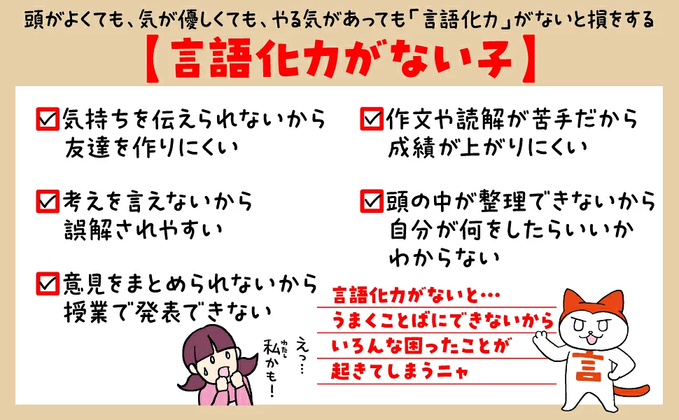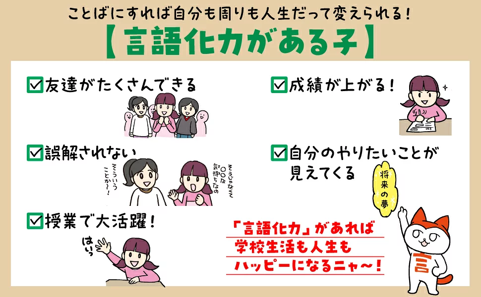 「ことばにする力=言語化力」はすべての能力の基礎。作文力や意見を言う力がつき成績があがるだけではなく、親や友達や先生とのコミュニケーションがスムーズになり、自分の夢を明確に描くこともできるように!AIを使いこなすにも言語化力は必須。これからの時代を生きる子どもたちに最も必要な能力が遊ぶだけで身につく