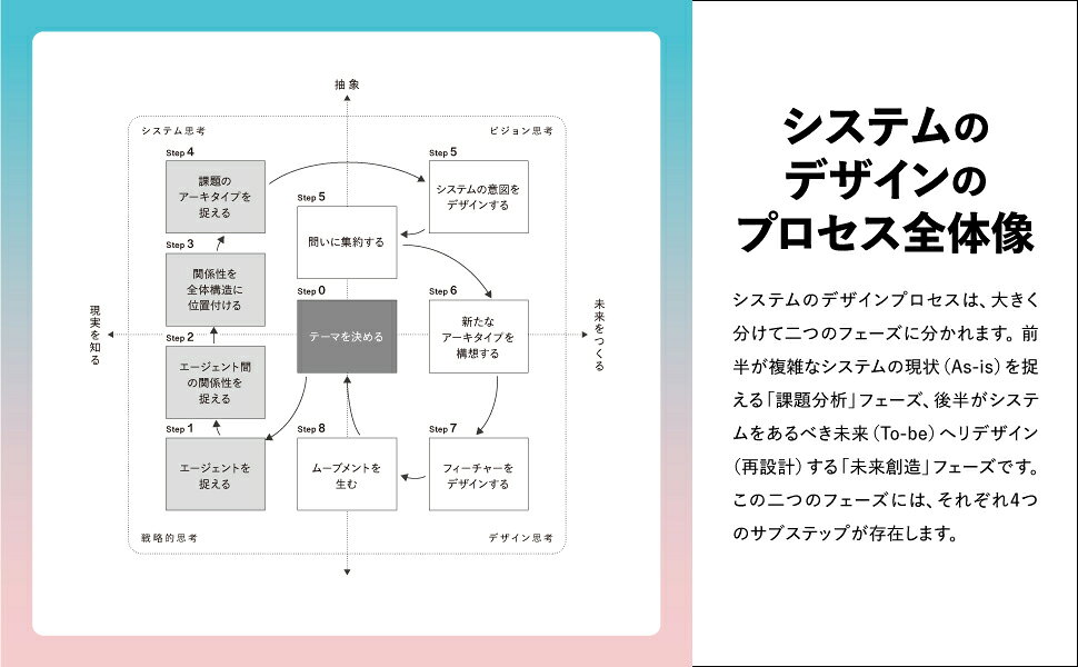 本書の最大の特徴は、理論だけでなく実践に重点を置いていることです。著者が開発した8つのステップからなる実践プロセスを詳細に解説し、読者が実際にシステムのデザインを行えるよう構成されています。前半の「課題分析フェーズ」では、複雑なシステムの現状を捉える4つのステップを、後半の「未来創造フェーズ」では、システムをあるべき姿へとリデザインする4つのステップを学べます。各ステップには具体的な思考法、メソッド、マインドセットが示されており、読者は段階的にスキルを習得できます。