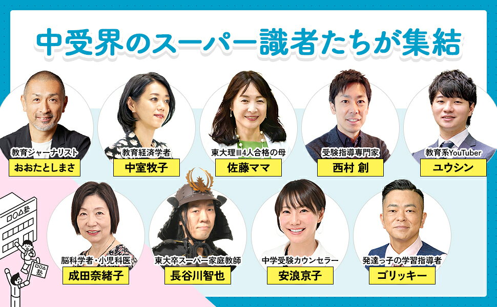 教育経済学者 中室牧子/教育ジャーナリスト おおたとしまさ/受験指導専門家 西村創/東大理III合格4人の母 佐藤ママ/脳科学者・小児科医 成田奈緒子/中学受験カウンセラー 安浪京子/教育系YouTuber ユウ