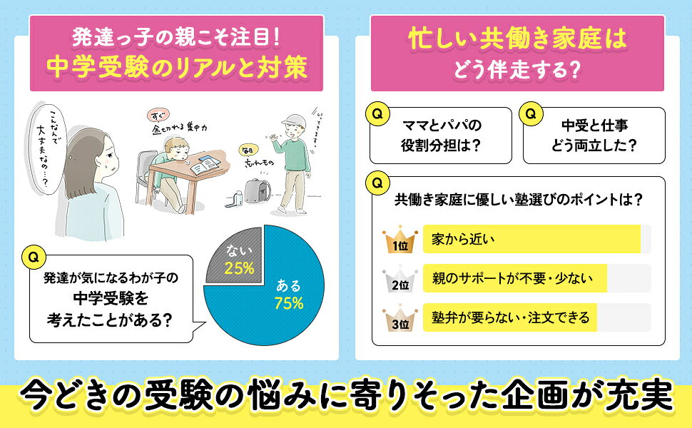 共働き・忙しい家庭…仕事と中学受験の両立術、ママとパパの役割分担、共働き家庭に優しい塾選びのポイントなどを徹底解説。