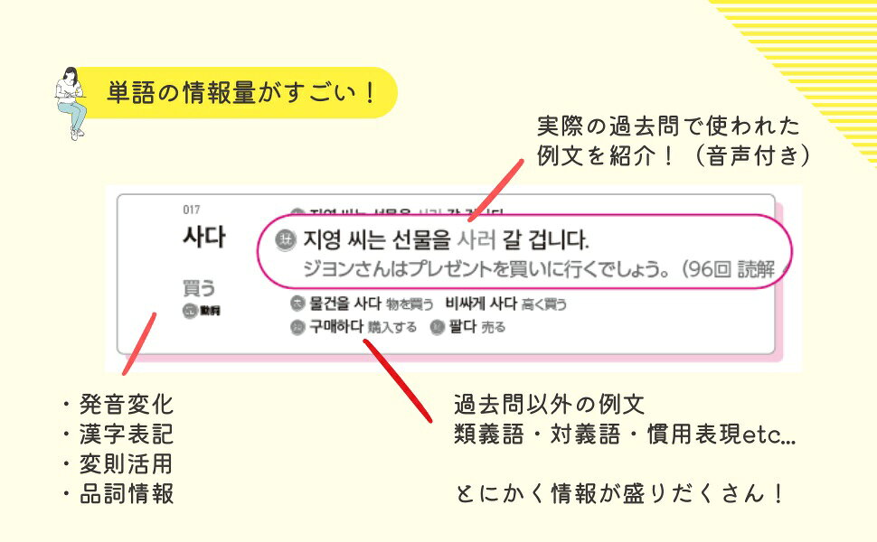 すべての語彙に、実際に過去のTOPIK本試験で使用された例文(音声付き)を掲載。さらに、別の文脈での用例や、類義語・対義語、関連表現なども豊富に取り入れることで、単なる語彙の暗記にとどまらない、より深く実践的な理解を促します。TOPIKで求められる「語彙の運用力」を養うための構成となっており、知識としての語彙から、試験で使える語彙へと確実にレベルアップできます。