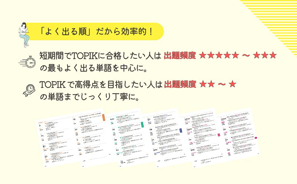 『FAST PASS TOPIK I 既出単語』は、過去にTOPIK 2本試験に実際に出題された語彙972語を厳選し、出題頻度に基づいて★★★★★〜★のランクに分類。特に出題頻度の高い★★★★★の単語から優先的に学習できるよう構成されているため、限られた学習時間の中でも、効率的かつ効果的な語彙強化が可能です。