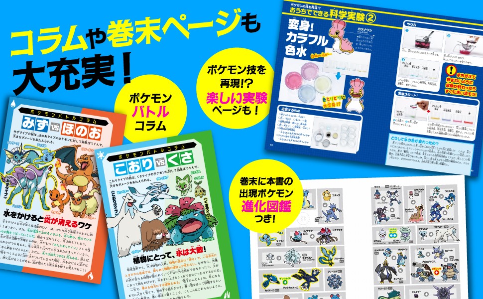 おうちでできる実験、ポケモンバトルコラム、巻末の本書に出現するポケモンの進化図鑑と興味をひく情報が満載!