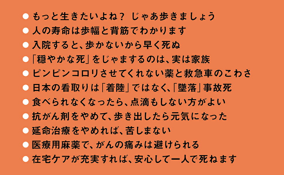 「歩けるうちは死にません」「抗がん剤をやめた方が長く生きる」「病院で体力の限界まで生かされるから苦しい」「認知症は長生きしたい人にとって勝ち組の証」「ひとり暮らしは、むしろ楽に死ねる」など「延命より満足を、治療より尊厳を」という選択を提唱。