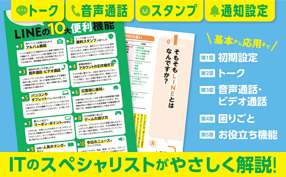 第1章 初心者はここからスタート!LINEの初期設定(そもそも「LINE」とはなんですか?/LINEは「無料」と聞きますが、本当にお金がかからないのですか? ほか)/第2章 基本の機能・操作から応用技まで!トーク編(孫や友人と「友だち」になるにはどうすればいいですか?/「QRコード」での友だち追加はどうすればいいですか? ほか)/第3章 相手の顔を見ながら楽しくおしゃべり!音声通話・ビデオ通話編(LINEの「音声通話」とスマホの「電話」は何が違いますか?/LINEの音楽通話を楽しむには、どうすればいいですか? ほか)/第4章 不審者対策から通知音設定・機種変更のやり方までわかる!LINEの困りごと編(知らない人からメッセージがきたときはどうすればいいですか?/知らない人からのメッセージを一切受け取りたくないときはどうすればいいですか? ほか)/第5章 使いこなせば暮らしがより豊かになる!LINEのお役立ち機能編(災害時に、LINEはどんなことで役に立ちますか?/お店で使えるお得な「クーポン」や「ポイント」をもらうには、どうすればいいですか? ほか)