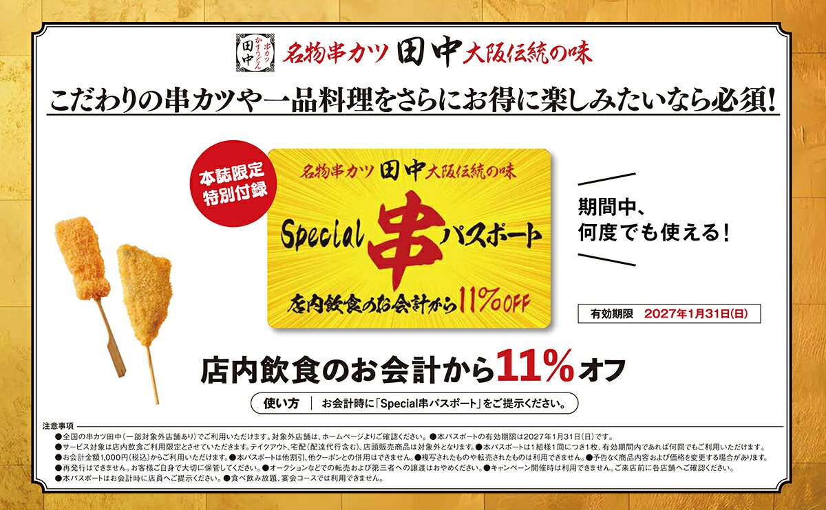 本誌限定の「special串パスポート」はありえないほど超お得!お会計から11%オフが期間中何度でも使えます!