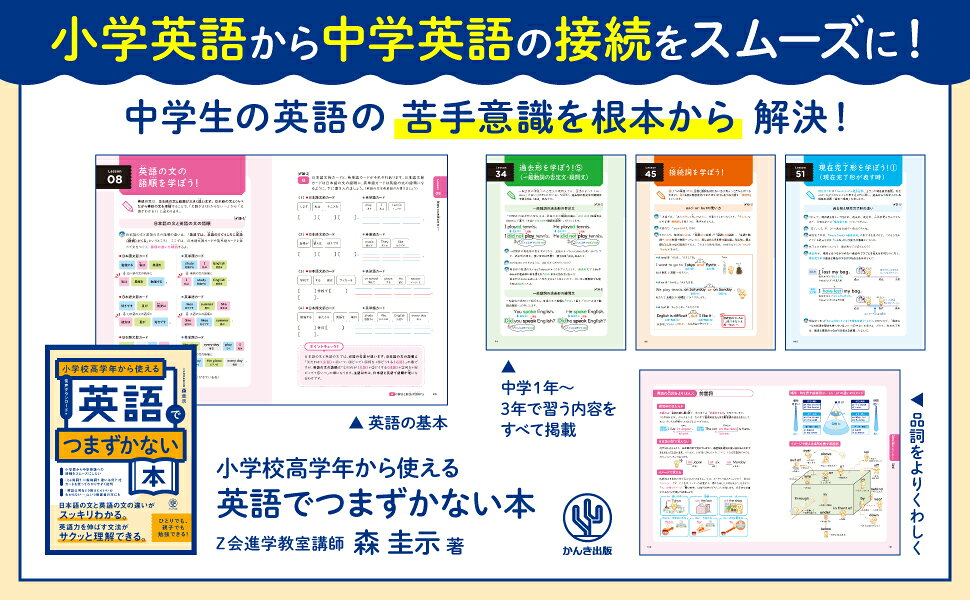 本書では、中学に入って英語につまずかないように、日本語と英語の違いから英語の仕組みをしっかり理解させ、小学英語から中学英語の接続をスムーズにします。わかりやすい解説とイラスト豊富な紙面で、小学校高学年から無理なく使える1冊になっております。