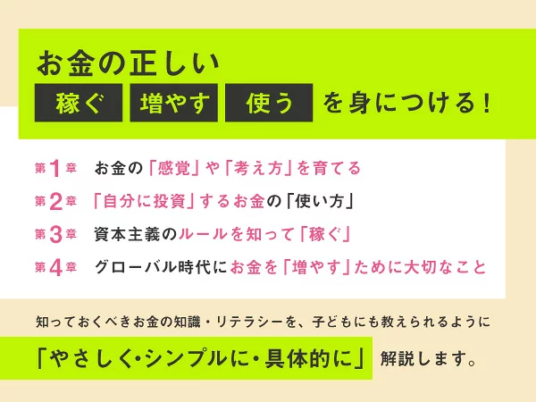 第1章 お金の「感覚」や「考え方」を育てる(「お金は貯めるもの」という感覚・考え方をリセットする/これからのインフレ経済をどうやって生きるべきか/いつから子どもにお金の教育を始めるべきか)/第2章 「自分に投資」するお金の「使い方」(節約をやめると「お金のリテラシー」が育つ/「自分のため」にお金を使う練習をする/お金の使い方を見直す/モノより経験へ投資する)/第3章 資本主義のルールを知って「稼ぐ」(「資本主義」の本質を知る/自分の価値を数字で表現する/「ワーカーの天井」を知っておく/いずれ「事業主」になるための働き方/「ワーカーの時代」を最大活用する/新しいスタイルの「事業主」になる)/第4章 グローバル時代にお金を「増やす」ために大切なこと(金融リテラシーがあれば世界で働ける/英語力と営業力は世界共通の能力/働きながら母になれ)