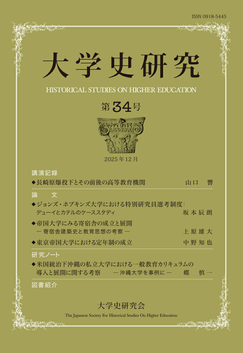 講演記録 長崎原爆投下とその前後の高等教育機関(山口響)/論文(ジョンズ・ホプキンズ大学における特別研究員選考制度:デューイとカテルのケーススタディ(坂本辰朗)/帝国大学にみる寄宿舎の成立と展開ー寄宿舎建築史と教育思想の考察ー(上原雄大)/東京帝国大学における定年制の成立(中野知也))/研究ノート 米国統治下沖縄の私立大学における一般教育カリキュラムの導入と展開に関する考察ー沖縄大学を事例にー(蝶慎一)/図書紹介 安原義仁著『イギリス大学史ー中世から現代までー』(福石賢一)