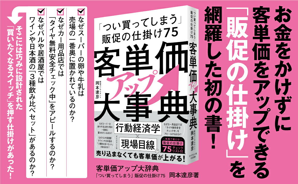 ●なぜカー用品店では、「タイヤ無料安全点検」をしてくれるのか? なぜスーパーの卵や牛乳は売場の一番奥に置かれているのか? なぜバルや居酒屋ではワインや日本酒の「3種飲み比べセット」があるのか? なぜバスツアーでは「入場料・昼食・お土産込み」の価格表示になっているのか?そこには巧みに設計された「つい買いたくなる」販促の仕掛けがあった。