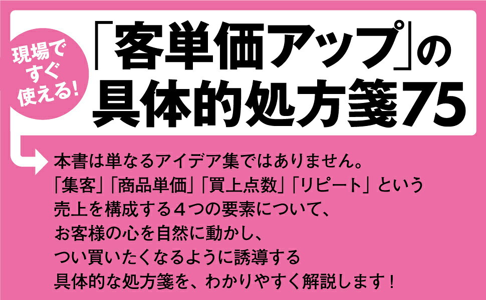 ★「集客」「商品単価」「買上点数」「リピート」という、売上を構成するすべての要素において、お客様の心理を動かし、単価を押し上げるための「具体的な処方箋」を75の事例として解説!