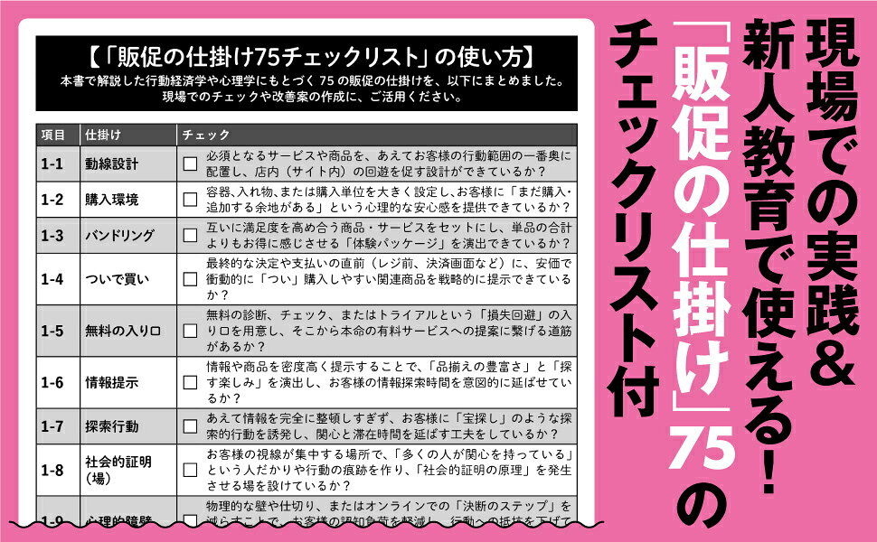 第1章 「あと一品」が自然にかごに入る!【買上点数アップ】の仕掛け〜「ついで買い」と「セット買い」を誘発し、かごの中身を増やす/第2章 「高いほう」が魅力的に見える!【商品単価アップ】の仕掛け〜「アンカリング」と「自己決定権」を操り、「イケア効果」で納得の単価へ導く/第3章 「値段以上の価値」を感じさせる!【価格抵抗払拭】の仕掛け〜五感と心理テクニックで、価格を「安く」感じさせる/第4章 「買わない理由」を消し去る!【決定率・成約率アップ】の仕掛け〜不安と迷いを取り除き、最後の一歩を踏み出させる/第5章 「また来たい」が自然に生まれる!【リピート・LTVアップ】の仕掛け〜記憶に残る体験と仕組みで、生涯顧客価値を上げる/第6章 【店舗・施設運営編】快適と効率を両立させる仕掛け〜顧客満足度を下げずに、回転率と利益を最大化する