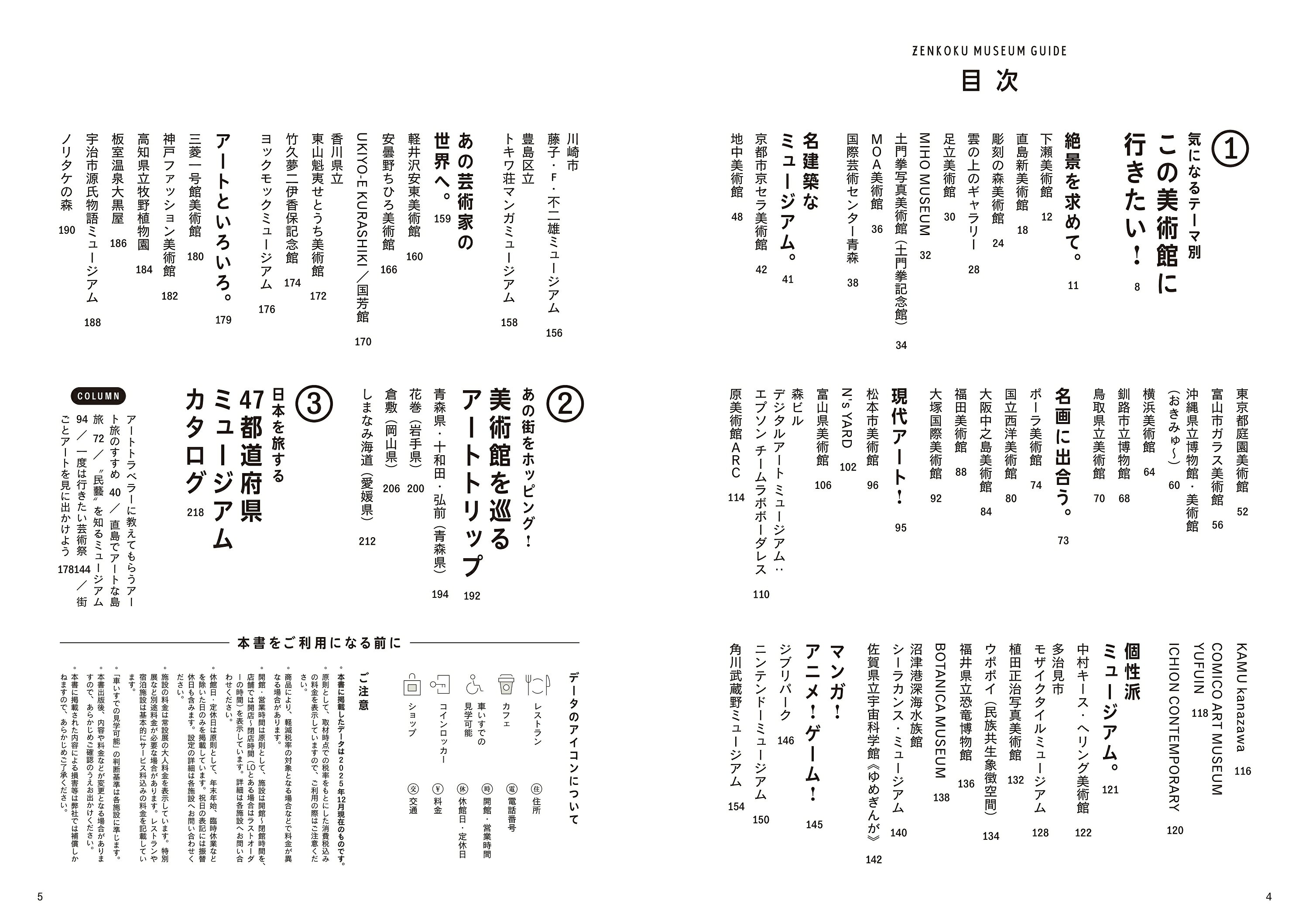 1 気になるテーマ別 この美術館に行きたい!(絶景を求めて。/名建築なミュージアム。/名画に出合う。/現代アート!/個性派ミュージアム。/マンガ!アニメ!ゲーム!/あの芸術家の世界へ。/アートといろいろ。)/2 あの街をホッピング!美術館を巡るアートトリップ(青森県・十和田・弘前(青森県)/花巻(岩手県)/倉敷(岡山県)/しまなみ海道(愛媛県))/3 日本を旅する 47都道府県ミュージアムカタログ