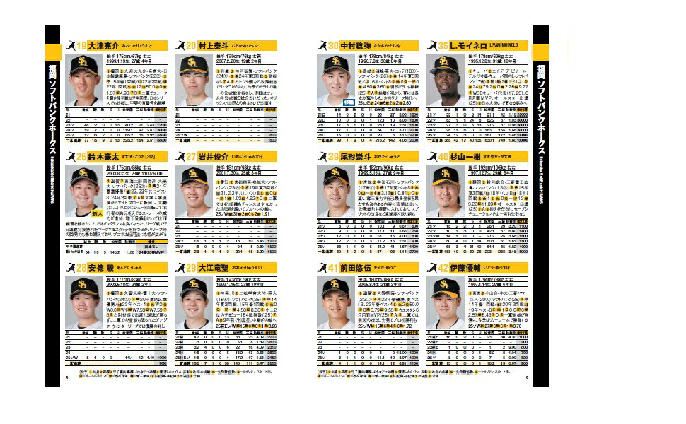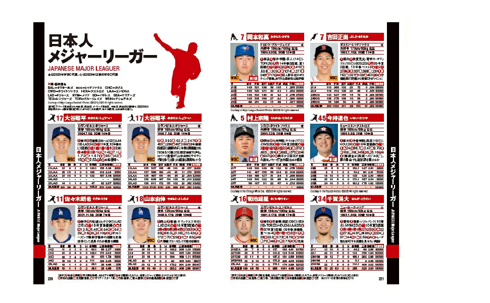 全球団の監督・コーチも顔写真入りで紹介。さらに、ドジャース所属の大谷翔平選手や山本由伸選手、佐々木朗希選手、新加入のアストロズ所属の今井達也選手、ホワイトソックス所属の村上宗隆選手、ブルージェイズ所属の岡本和真選手をはじめとする日本人メジャーリーガーのデータも!