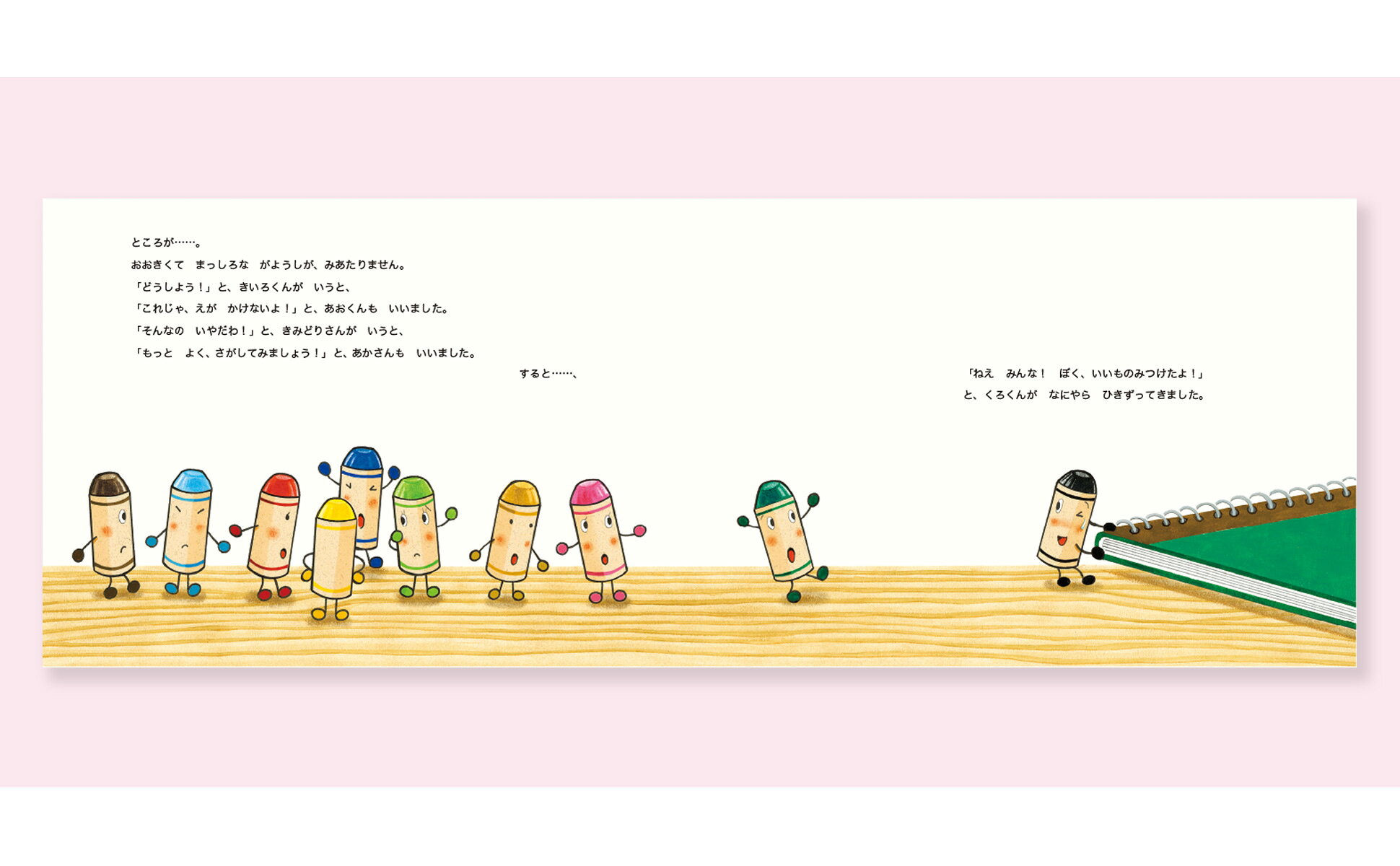 「ねえ みんな! いいものみつけてきたよ!」くろくんがなにやらひきずってきました。それは「じゆうがちょう」でした。「このかみは、いつもとちがうね!」「かるくてうすくてやわらかいよ!」ちゃいろくんが、げんきよくかきはじめると……おや? なにかもようがでてきました。「おえかきすると、もようがでてくるなんて、ふしぎ!」「みんなで、いろんなもようをかいてみよう!」くれよんたちは、いえのなかに、いろんなもようをさがしにいきました。すると……。