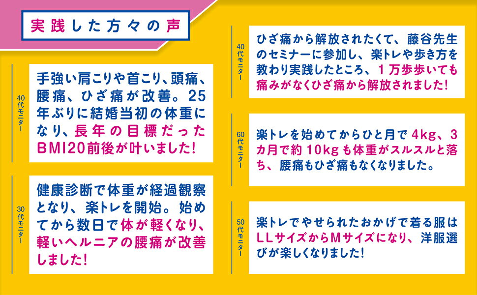 楽だから苦もなく続けられるうえ、早い段階で体中の痛みやこりが消えていき、体が楽になって容易に動くようになり、全身がみるみるうちに引き締まっていきます。(本書はじめにより)