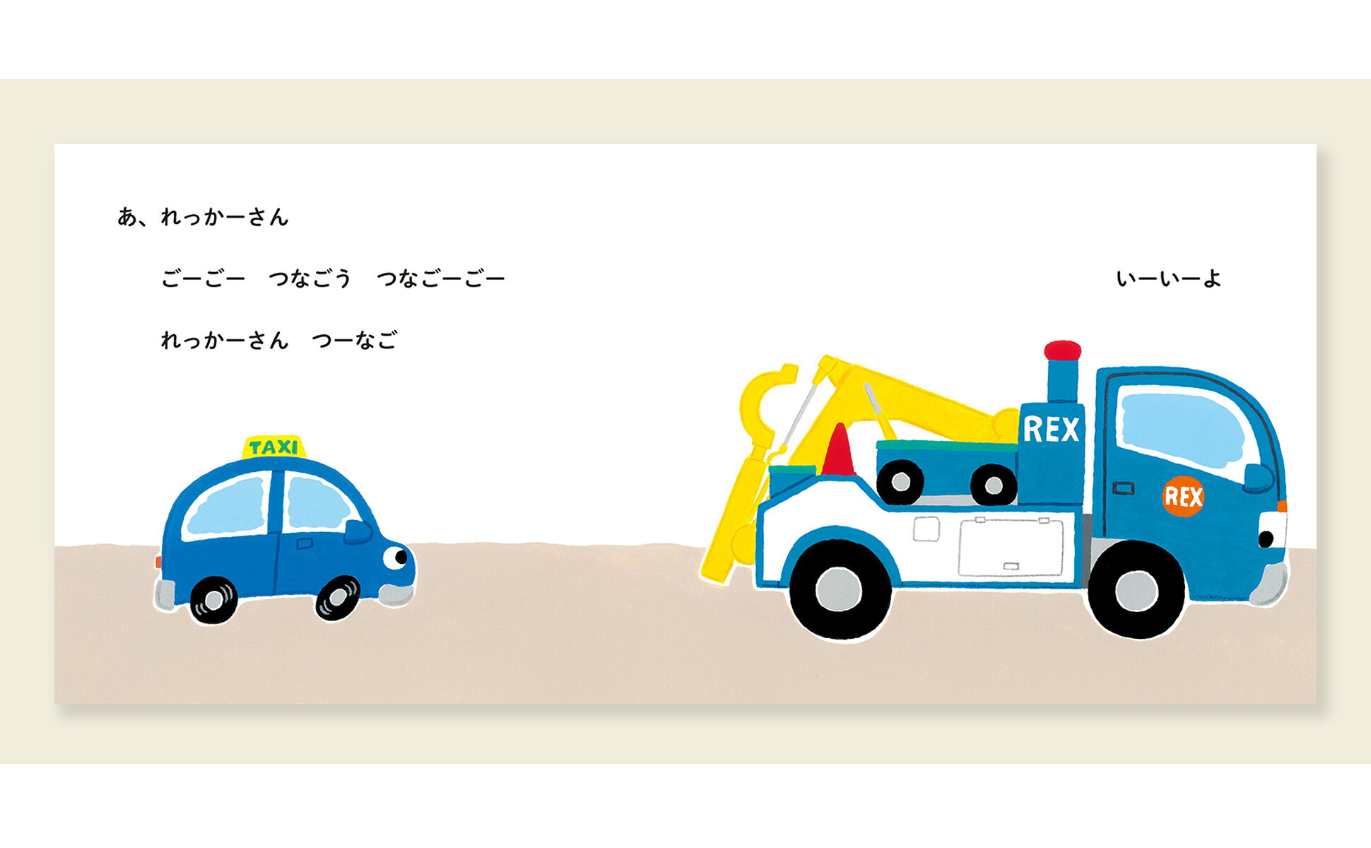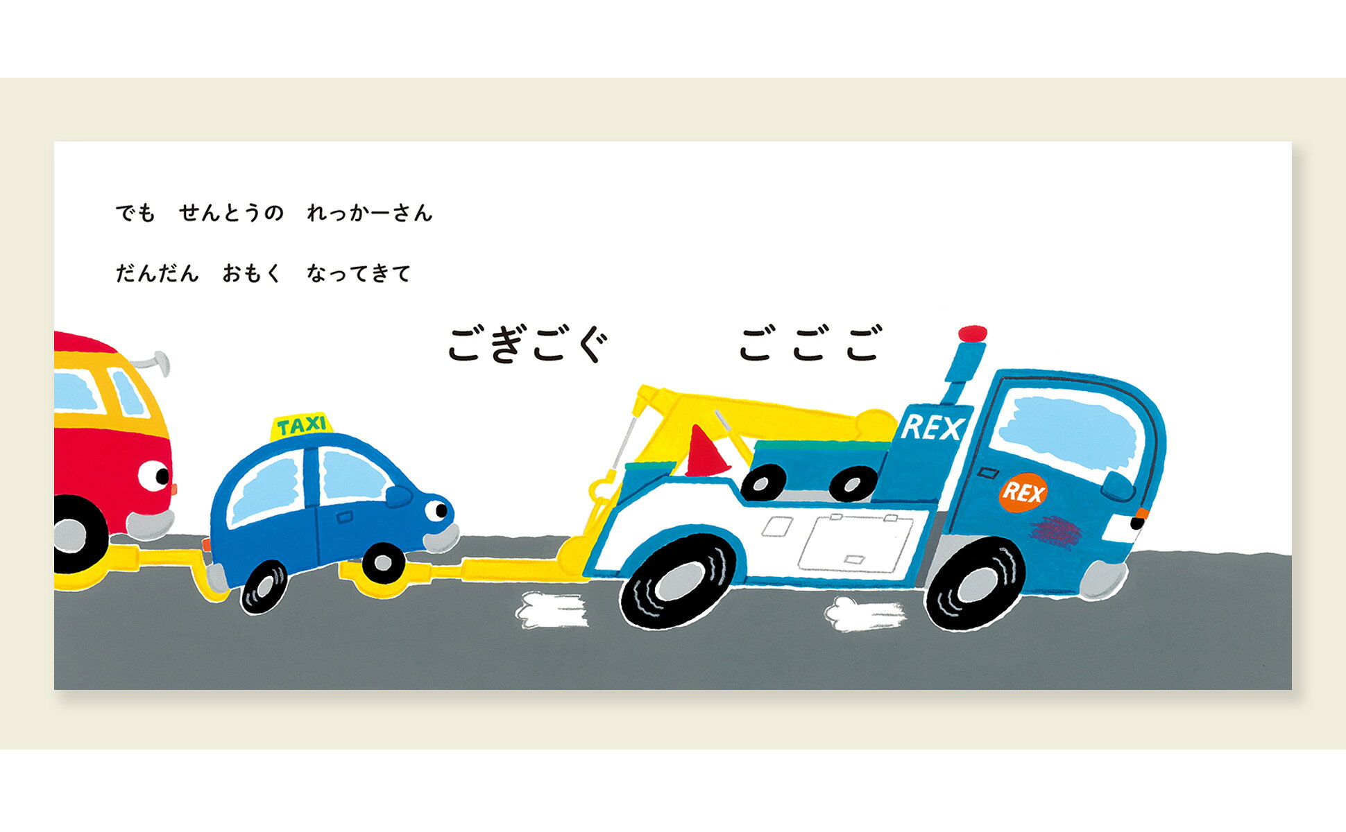 たくしーさんが、ごーごーごー。れっかーさんをみつけたよ。