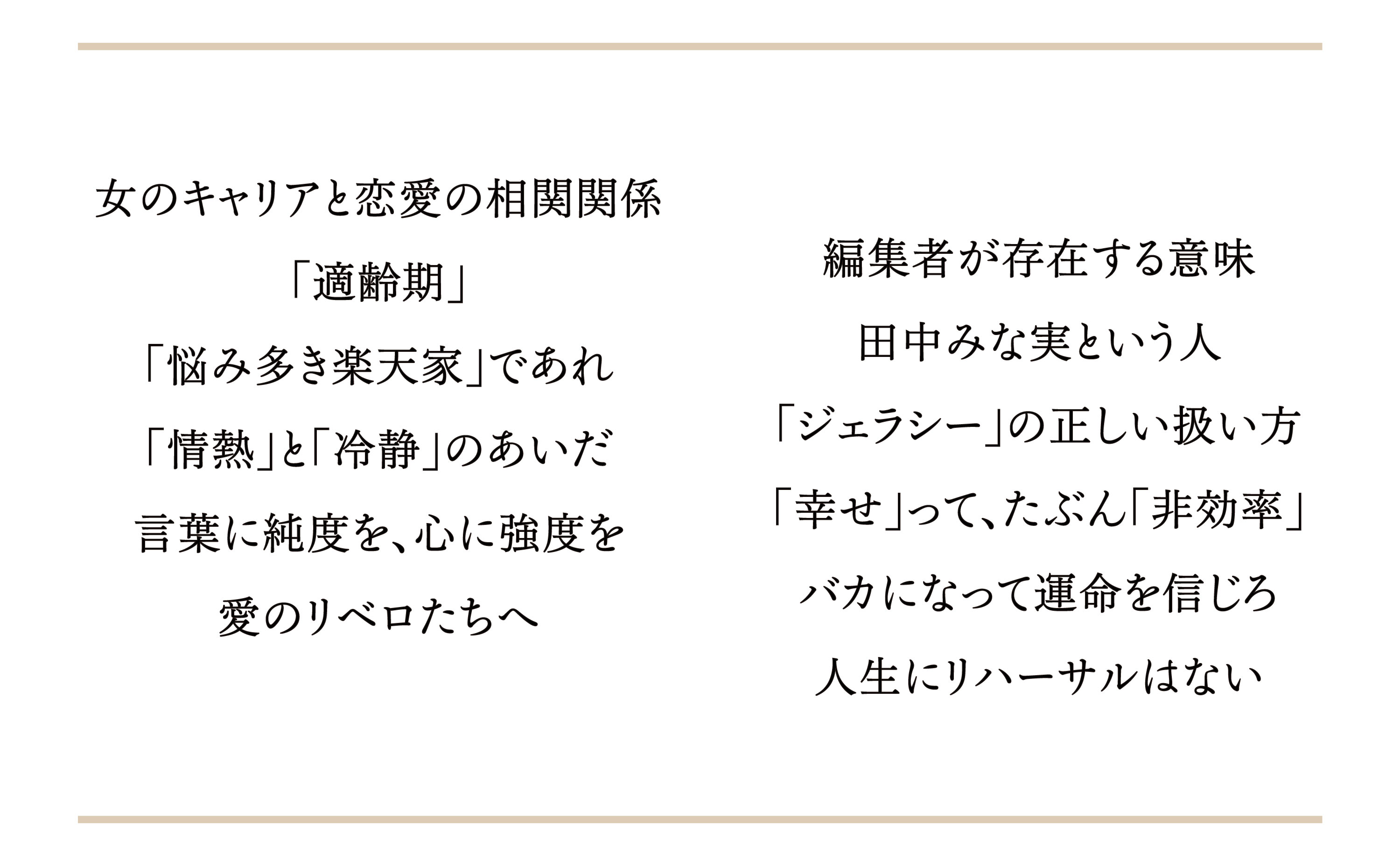 1章 私たちは皆、未完成(“完璧”からの解放/ないものねだり ほか)/2章 恋愛や結婚、男女に関する偏見まみれの散文(愛のリベロたちへ/「but」ではなくて、「and」 ほか)/3章 キャリアと愛。女の人生、すべては同時に叶わない(ヒットメーカーの定義/編集者が存在する意味 ほか)/4章 「闇」をも手懐けよ(最低最悪な恋人を「断捨離」したら人生が好転した話/「ジェラシー」の正しい扱い方 ほか)/5章 すべてを、愛で、整える(「幸せ」って、たぶん「非効率」/シンプルに生きる ほか)