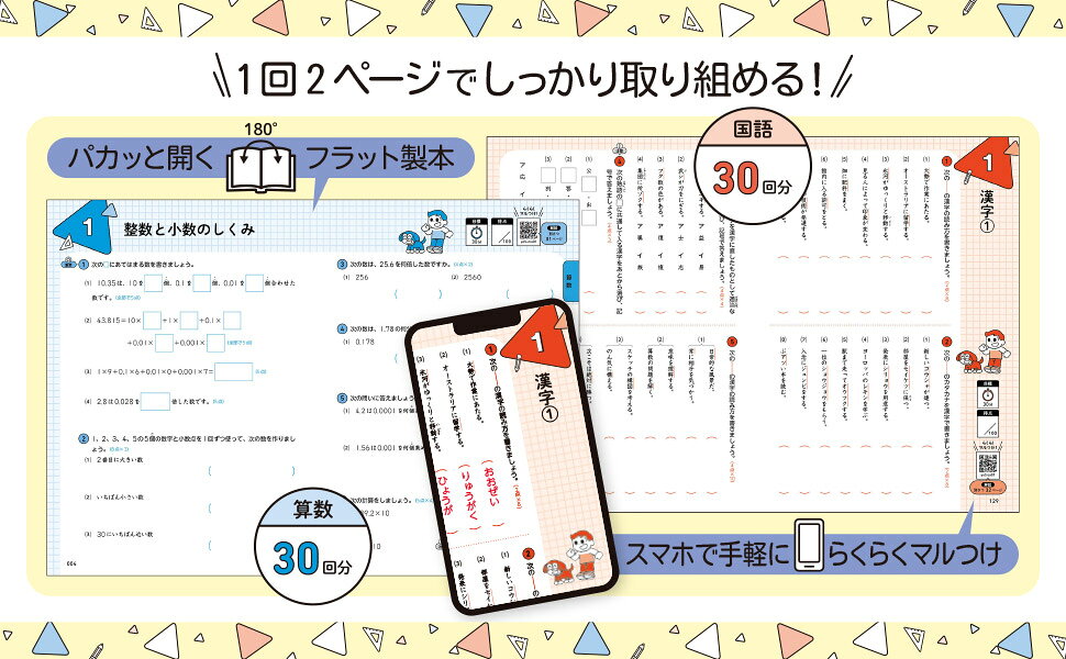 1回30分、各単元見開き2ページの取り組みやすい分量です。理解を深めるために必要十分なボリュームにまとめており、重要な学習事項をしっかりと定着させることができます。また、180度フラットに開く製本なので書き込みがしやすく、学習中にページが閉じるストレスを感じずに快適に学習できます。