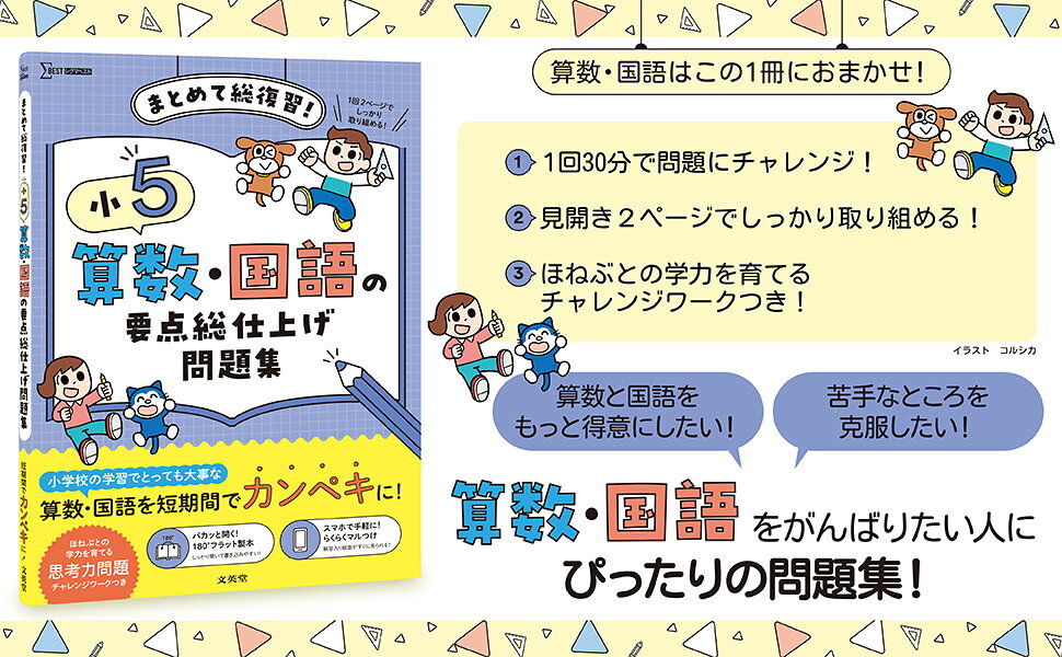まとめて総復習!算数・国語を短期間でカンペキに!小学校の学習の中でも特に重要な「算数」と「国語」を重点的に復習できるので、短期間での基礎固めと総仕上げに最適です。1回2ページでしっかり取り組める!1回ぶんを見開き2ページにぎゅっとまとめました。取り組みやすい分量で、重要な学習事項を確実に定着させることができます。ほねぶとの学力を育てるチャレンジワークつき!特集ページとして、主体的に考えられる力をつけるために必要な「判断力」「思考力」「表現力」を育てるオリジナル問題を収録しています。