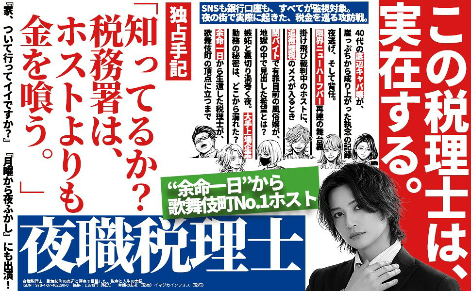 「余命一日」から生還した歌舞伎町No.1ホスト兼税理士・夜野仁が放つ、夜の街の住人たちの切実すぎる人生と、命と金を守る税金の実録。