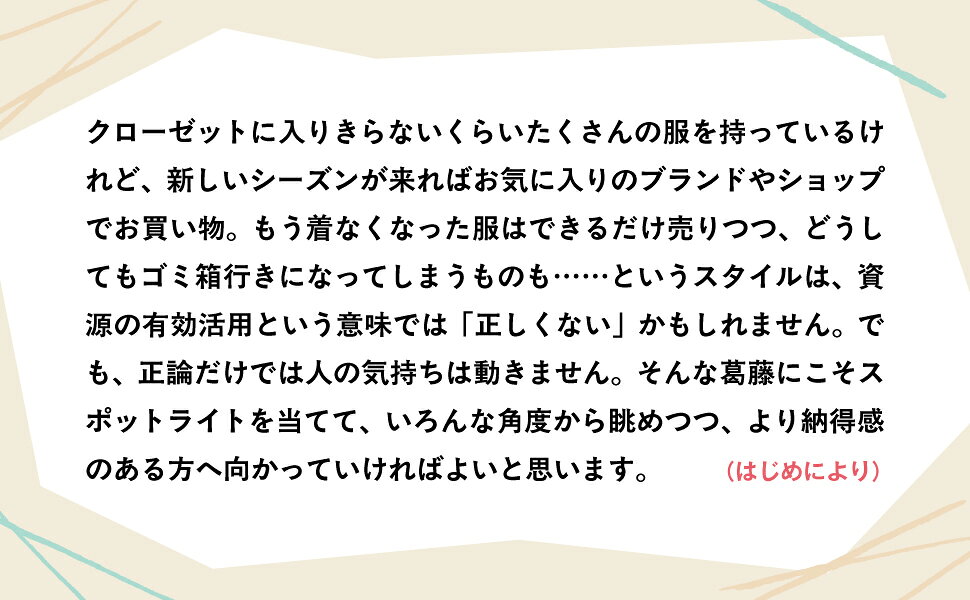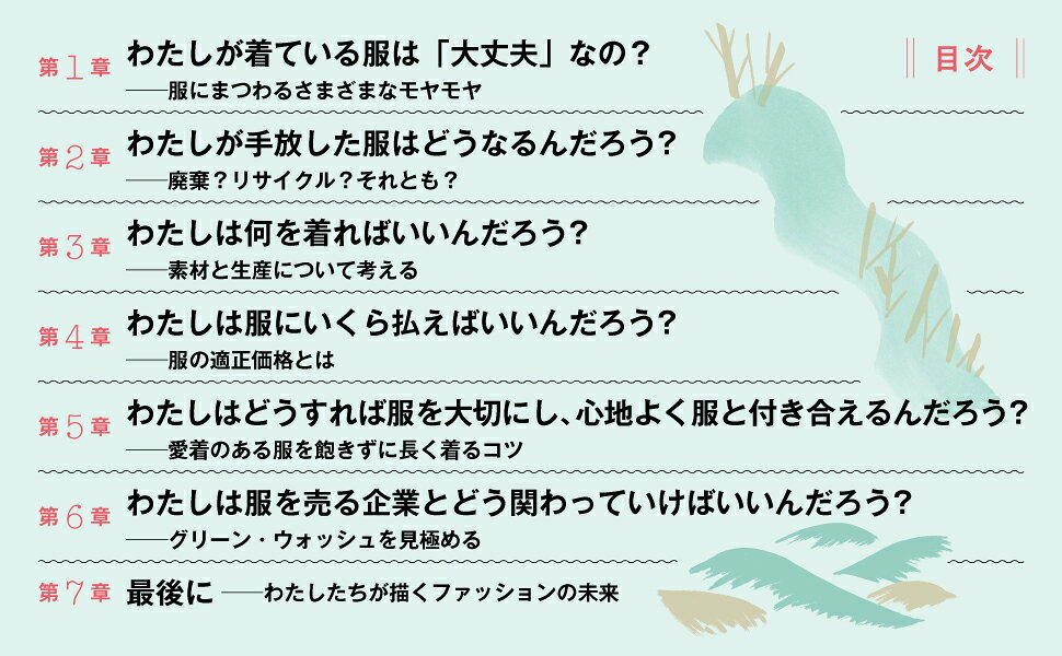第1章 わたしが着ている服は「大丈夫」なの? 服にまつわるさまざまなモヤモヤ/第2章 わたしが手放した服はどうなるんだろう? 廃棄?リサイクル?それとも?/第3章 わたしは何を着ればいいんだろう? 素材と生産について考える/第4章 わたしは服にいくら払えばいいんだろう? 服の適正価格とは/第5章 わたしはどうすれば服を大切にし、心地よく服と付き合えるんだろう? 愛着のある服を飽きずに長く着るコツ/第6章 わたしは服を売る企業とどう関わっていけばいいんだろう? グリーン・ウォッシュを見極める/第7章 最後に わたしたちが描くファッションの未来
