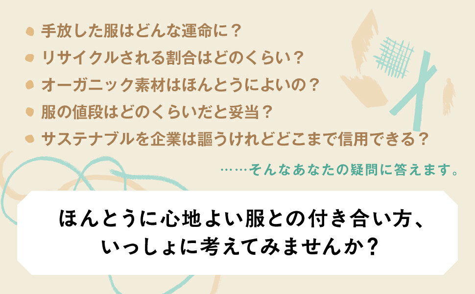 手放した服はどんな運命に? リサイクルされる割合はどのくらい? オーガニック素材はほんとうによいの? 服の値段はどのくらいだと妥当? サステナブルを企業は謳うけれどどこまで信用できる?……そんなあなたの疑問に答えます。ほんとうに心地よい服との付き合い方、いっしょに考えてみませんか?